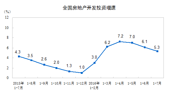 2016年1-7月份,全國房地產開發投資55361億元,同比名義增長5.3%,增速比1-6月份回落0.8個百分點。其中,住宅投資36981億元,增長4.5%,增速回落1.1個百分點。住宅投資占房地產開發投資的比重為66.8%。