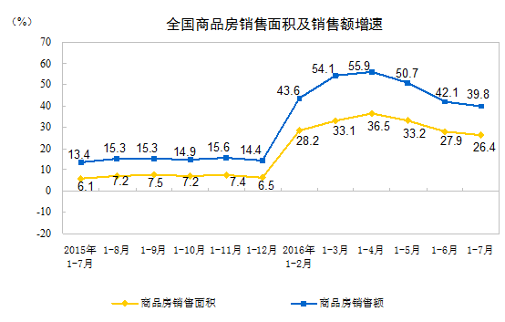 1-7月份,商品房銷售面積75760萬平方米,同比增長26.4%,增速比1-6月份回落1.5個百分點。其中,住宅銷售面積增長26.7%,辦公樓銷售面積增長41.3%,商業營業用房銷售面積增長15.5%。商品房銷售額57569億元,增長39.8%,增速回落2.3個百分點。其中,住宅銷售額增長41.2%,辦公樓銷售額增長65.3%,商業營業用房銷售額增長17.6%。