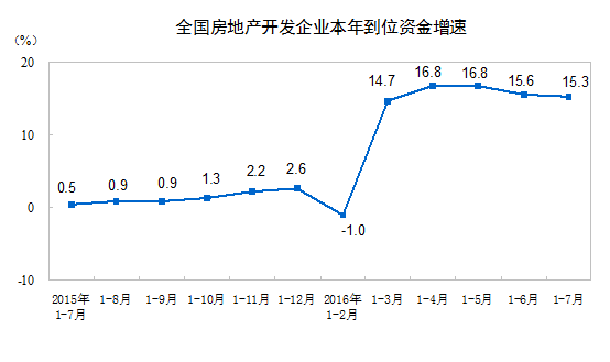 1-7月份,房地產開發企業到位資金79881億元,同比增長15.3%,增速比1-6月份回落0.3個百分點。其中,國內貸款12605億元,增長0.7%;利用外資93億元,下降49.8%;自籌資金27877億元,增長0.4%;其他資金39307億元,增長36.3%。在其他資金中,定金及預收款22321億元,增長31.6%;個人按揭貸款13305億元,增長54.6%。