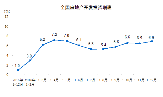 2016年,全國房地產開發投資102581億元,比上年名義增長6.9%(扣除價格因素實際增長7.5%),增速比1-11月份提高0.4個百分點。其中,住宅投資68704億元,增長6.4%,增速提高0.4個百分點。住宅投資占房地產開發投資的比重為67.0%。