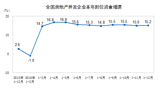2016年,房地產開發企業到位資金144214億元,比上年增長15.2%,增速比1-11月份提高0.2個百分點。其中,國內貸款21512億元,增長6.4%;利用外資140億元,下降52.6%;自籌資金49133億元,增長0.2%;其他資金73428億元,增長31.9%。在其他資金中,定金及預收款41952億元,增長29.0%;個人按揭貸款24403億元,增長46.5%。