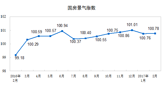 2月份,房地產(chǎn)開(kāi)發(fā)景氣指數(shù)(簡(jiǎn)稱“國(guó)房景氣指數(shù)”,今年起發(fā)布的是基期修定后的值)為100.78,比1月份提高0.02點(diǎn)。