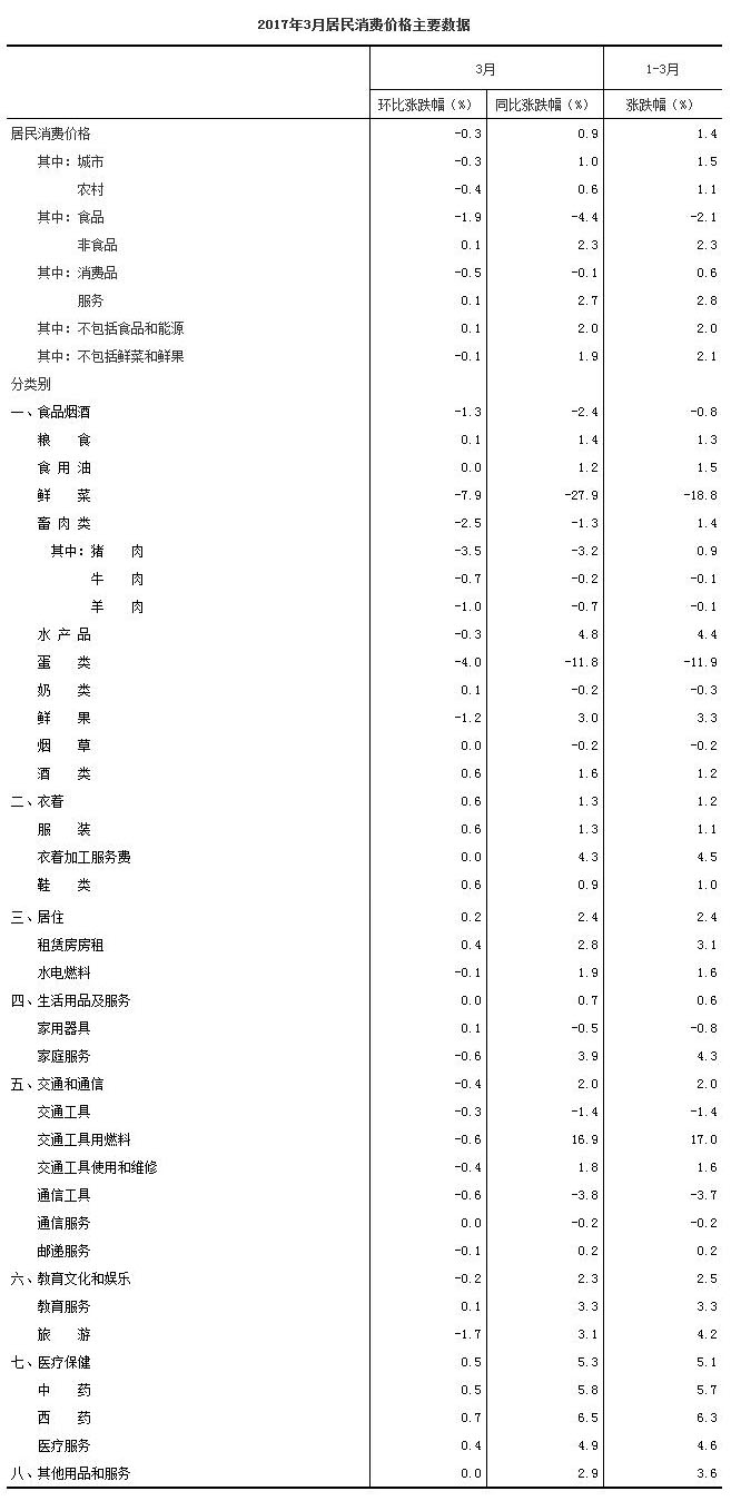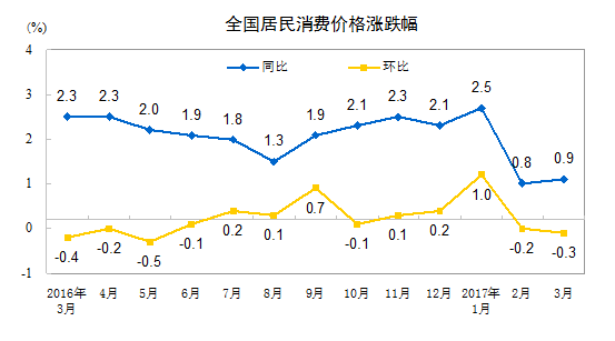 2017年3月份,全國居民消費價格總水平同比上漲0.9%。其中,城市上漲1.0%,農村上漲0.6%;食品價格下降4.4%,非食品價格上漲2.3%;消費品價格下降0.1%,服務價格上漲2.7%。一季度,全國居民消費價格總水平比去年同期上漲1.4%。