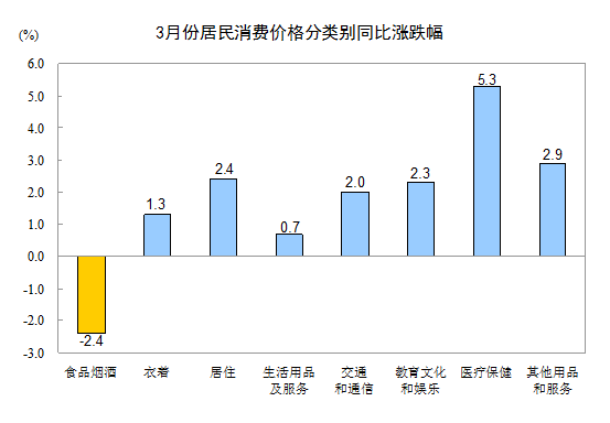 3月份,其他七大類價格同比均有所上漲。其中,醫療保健、其他用品和服務、居住、教育文化和娛樂、交通和通信、衣著、生活用品及服務價格分別上漲5.3%、2.9%、2.4%、2.3%、2.0%、1.3%和0.7%。