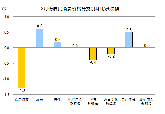 3月份,全國居民消費價格總水平環比下降0.3%。其中,城市下降0.3%,農村下降0.4%;食品價格下降1.9%,非食品價格上漲0.1%;消費品價格下降0.5%,服務價格上漲0.1%。