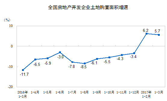 1-3月份,房地產開發企業土地購置面積3782萬平方米,同比增長5.7%,增速比1-2月份回落0.5個百分點;土地成交價款1359億元,增長16.7%,增速提高4個百分點。