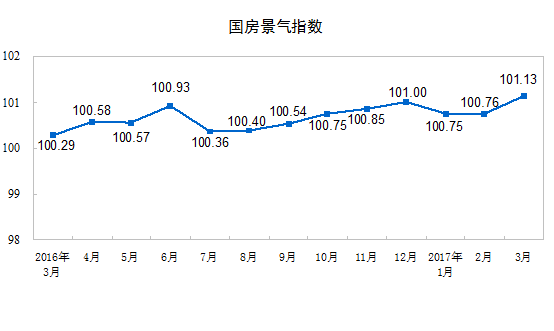 3月份,房地產開發景氣指數(簡稱“國房景氣指數”)為101.13,比2月份提高0.37點。
