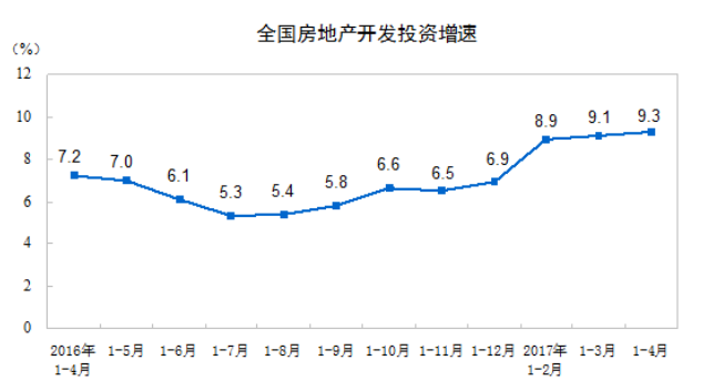 2017年1-4月份,全國房地產開發投資27732億元,同比名義增長9.3%,增速比1-3月份提高0.2個百分點。其中,住宅投資18671億元,增長10.6%,增速回落0.6個百分點。住宅投資占房地產開發投資的比重為67.3%。