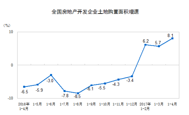 1-4月份,房地產開發企業土地購置面積5528萬平方米,同比增長8.1%,增速比1-3月份提高2.4個百分點;土地成交價款2104億元,增長34.2%,增速提高17.5個百分點。