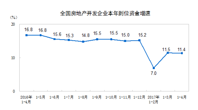 1-4月份,房地產開發企業到位資金47221億元,同比增長11.4%,增速比1-3月份回落0.1個百分點。其中,國內貸款8774億元,增長17.0%;利用外資74億元,增長115.3%;自籌資金14217億元,下降4.7%;其他資金24156億元,增長21.3%。在其他資金中,定金及預收款13842億元,增長21.7%;個人按揭貸款7662億元,增長14.5%。