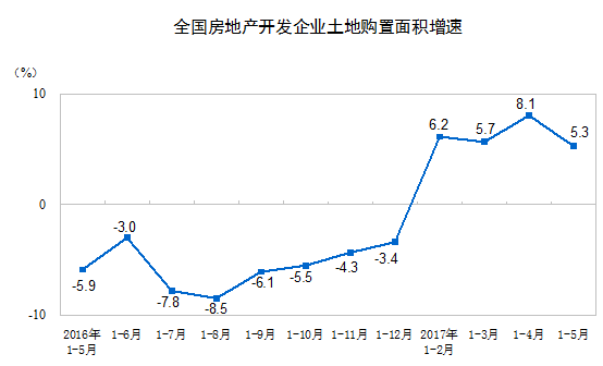 1-5月份,房地產(chǎn)開發(fā)企業(yè)土地購置面積7580萬平方米,同比增長5.3%,增速比1-4月份回落2.8個百分點;土地成交價款3036億元,增長32.3%,增速回落1.9個百分點。