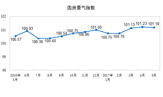 5月份,房地產(chǎn)開發(fā)景氣指數(shù)(簡稱“國房景氣指數(shù)”)為101.18,比4月份提高0.05點。