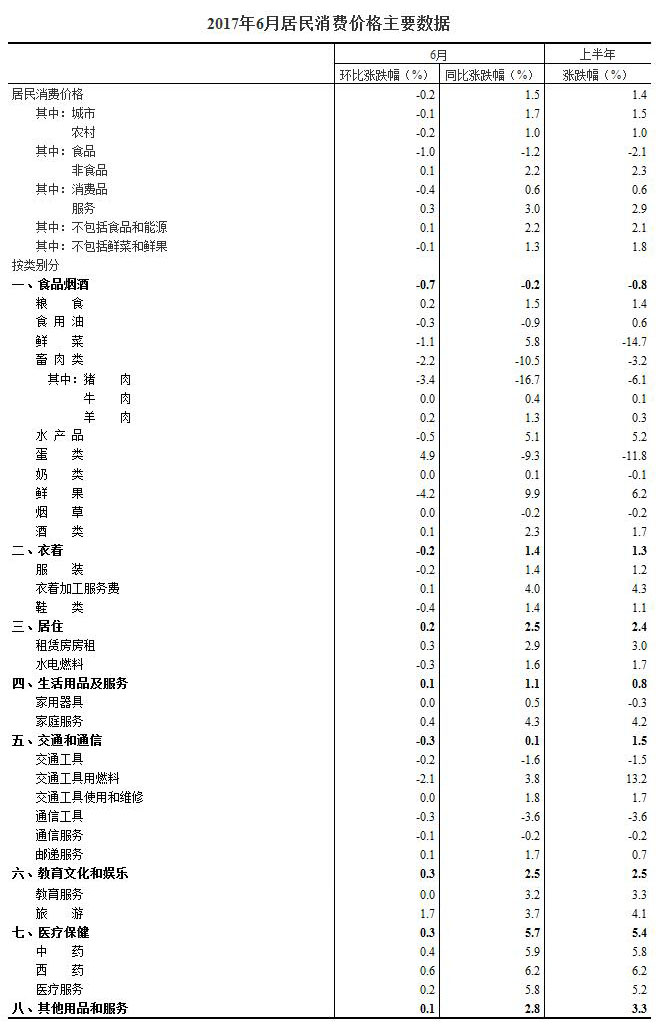 2017年6月份,全國居民消費價格同比上漲1.5%。其中,城市上漲1.7%,農(nóng)村上漲1.0%;食品價格下降1.2%,非食品價格上漲2.2%;消費品價格上漲0.6%,服務(wù)價格上漲3.0%。上半年,全國居民消費價格總水平比去年同期上漲1.4%。
