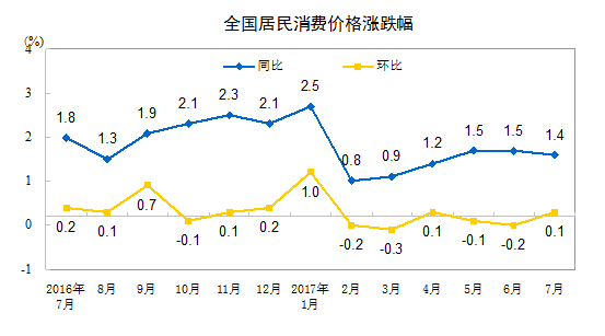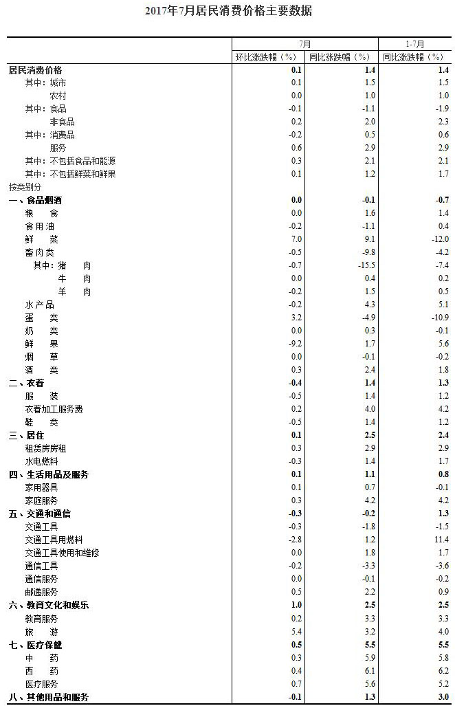 2017年7月份,全國居民消費價格同比上漲1.4%。其中,城市上漲1.5%,農村上漲1.0%;食品價格下降1.1%,非食品價格上漲2.0%;消費品價格上漲0.5%,服務價格上漲2.9%。1-7月平均,全國居民消費價格總水平比去年同期上漲1.4%。