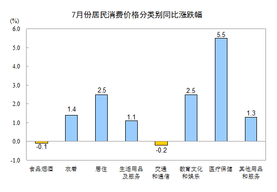 7月份,其他七大類價格同比六漲一降。其中,醫療保健價格上漲5.5%,居住、教育文化和娛樂價格均上漲2.5%,衣著、其他用品和服務、生活用品及服務價格分別上漲1.4%、1.3%和1.1%;交通和通信價格下降0.2%。