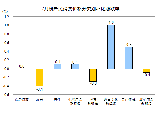 7月份,全國居民消費價格環比上漲0.1%。其中,城市上漲0.1%,農村持平;食品價格下降0.1%,非食品價格上漲0.2%;消費品價格下降0.2%,服務價格上漲0.6%。