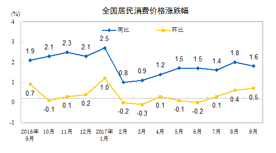 2017年9月份居民消費價格同比上漲1.6%