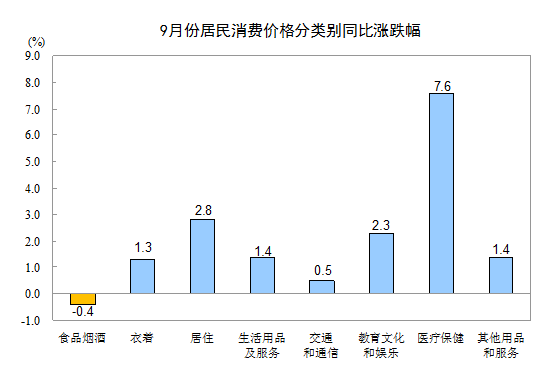 9月份,其他七大類價格同比均有不同程度的上漲。其中,醫療保健、居住、教育文化和娛樂價格分別上漲7.6%、2.8%和2.3%,生活用品及服務、其他用品和服務價格均上漲1.4%,衣著、交通和通信價格分別上漲1.3%和0.5%。