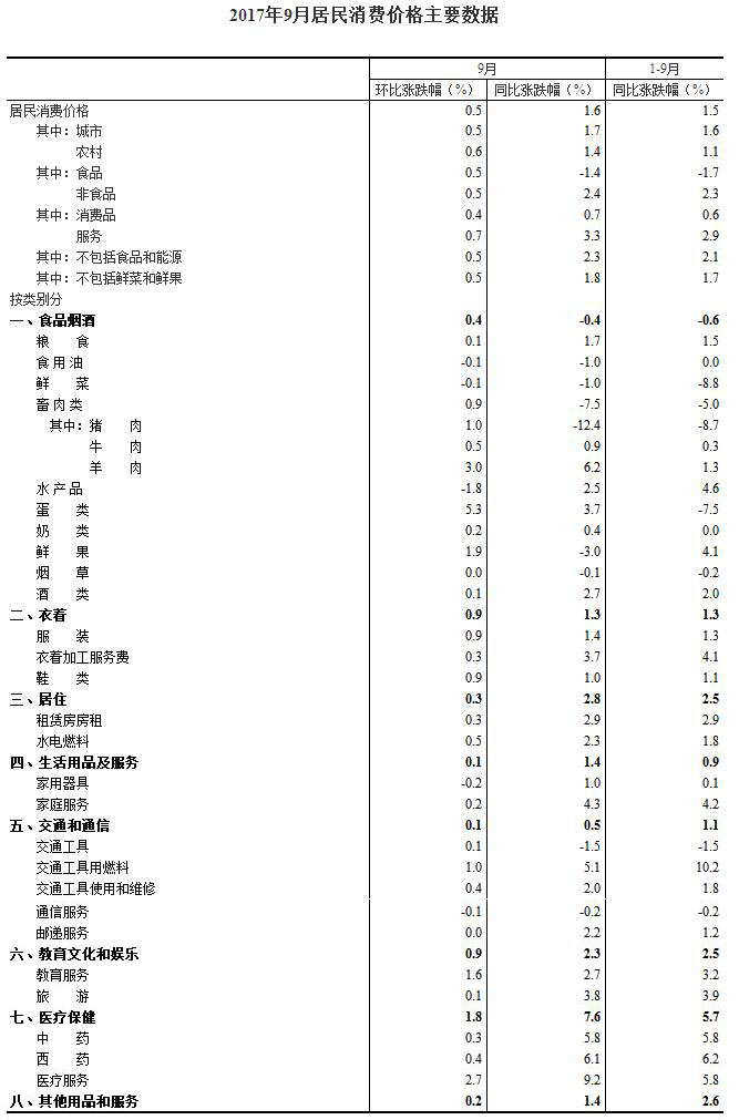 2017年9月份,全國居民消費價格同比上漲1.6%。其中,城市上漲1.7%,農村上漲1.4%;食品價格下降1.4%,非食品價格上漲2.4%;消費品價格上漲0.7%,服務價格上漲3.3%。1-9月平均,全國居民消費價格總水平比去年同期上漲1.5%。