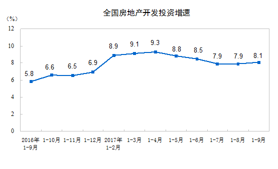 2017年1-9月份,全國房地產開發投資80644億元,同比名義增長8.1%,增速比1-8月份提高0.2個百分點。其中,住宅投資55109億元,增長10.4%,增速提高0.3個百分點。住宅投資占房地產開發投資的比重為68.3%。