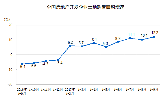 1-9月份,房地產開發企業土地購置面積16733萬平方米,同比增長12.2%,增速比1-8月份提高2.1個百分點;土地成交價款8149億元,增長46.3%,增速提高3.6個百分點。