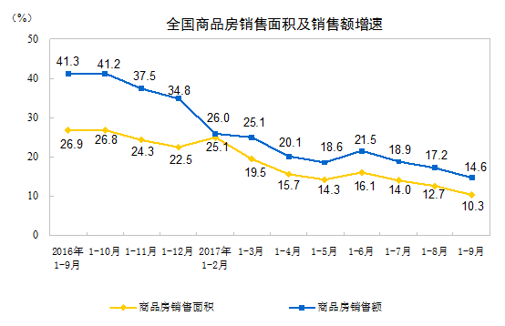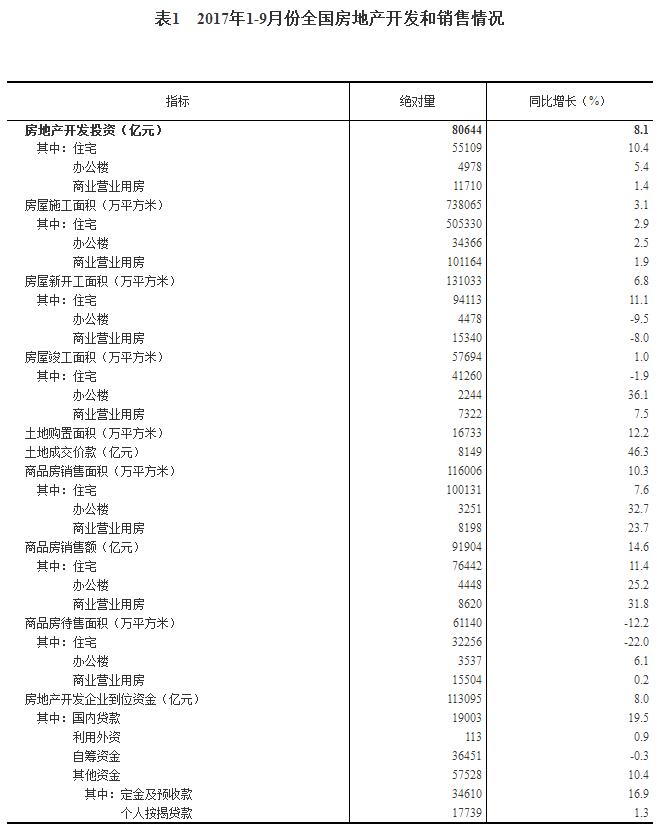1-9月份,商品房銷售面積116006萬平方米,同比增長10.3%,增速比1-8月份回落2.4個百分點。其中,住宅銷售面積增長7.6%,辦公樓銷售面積增長32.7%,商業營業用房銷售面積增長23.7%。商品房銷售額91904億元,增長14.6%,增速回落2.6個百分點。其中,住宅銷售額增長11.4%,辦公樓銷售額增長25.2%,商業營業用房銷售額增長31.8%。