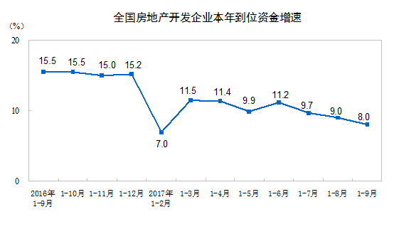 1-9月份,房地產開發企業到位資金113095億元,同比增長8.0%,增速比1-8月份回落1個百分點。其中,國內貸款19003億元,增長19.5%;利用外資113億元,增長0.9%;自籌資金36451億元,下降0.3%;其他資金57528億元,增長10.4%。在其他資金中,定金及預收款34610億元,增長16.9%;個人按揭貸款17739億元,增長1.3%。