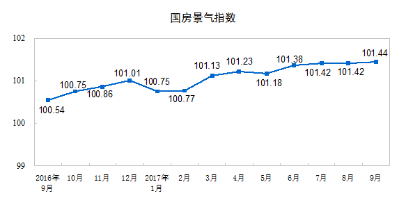 9月份,房地產開發景氣指數(簡稱“國房景氣指數”)為101.44,與8月份提高了0.02點。