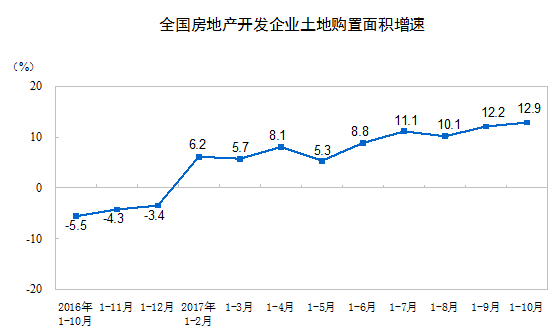 1-10月份,房地產(chǎn)開發(fā)企業(yè)土地購(gòu)置面積19048萬(wàn)平方米,同比增長(zhǎng)12.9%,增速比1-9月份提高0.7個(gè)百分點(diǎn);土地成交價(jià)款9695億元,增長(zhǎng)43.3%,增速回落3個(gè)百分點(diǎn)。