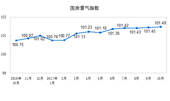10月份,房地產(chǎn)開發(fā)景氣指數(shù)(簡(jiǎn)稱“國(guó)房景氣指數(shù)”)為101.49,與9月份提高了0.04點(diǎn)。