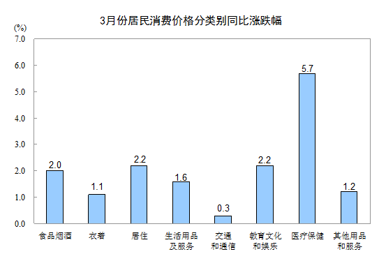 2018年3月份,全國居民消費價格同比上漲2.1%。其中,城市上漲2.1%,農村上漲1.9%;食品價格上漲2.1%,非食品價格上漲2.1%;消費品價格上漲1.6%,服務價格上漲2.8%。一季度,全國居民消費價格總水平比去年同期上漲2.1%。