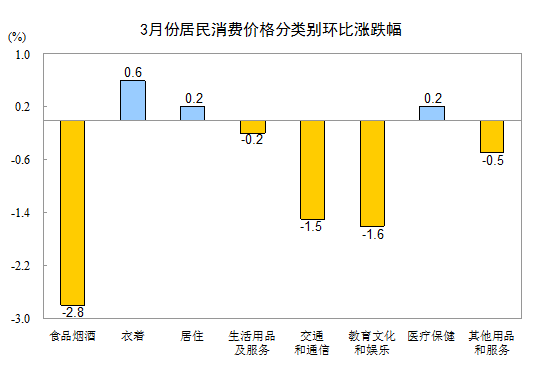 3月份,全國居民消費價格環(huán)比下降1.1%。其中,城市下降1.1%,農村下降1.2%;食品價格下降4.2%,非食品價格下降0.4%;消費品價格下降1.4%,服務價格下降0.7%。
