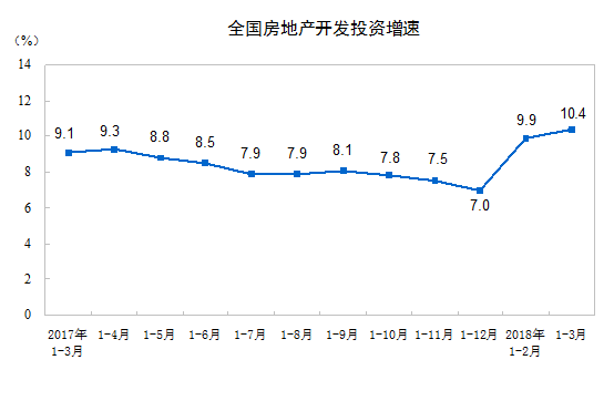2018年1-3月份,全國房地產(chǎn)開發(fā)投資21291億元,同比名義增長10.4%,增速比1-2月份提高0.5個百分點(diǎn)。其中,住宅投資14705億元,增長13.3%,增速提高1個百分點(diǎn)。住宅投資占房地產(chǎn)開發(fā)投資的比重為69.1%。
