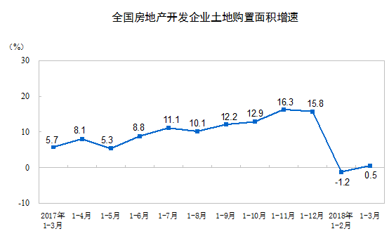 1-3月份,房地產(chǎn)開發(fā)企業(yè)土地購置面積3802萬平方米,同比增長0.5%,1-2月份為下降1.2%;土地成交價款1634億元,增長20.3%,增速提高20.3個百分點(diǎn)。