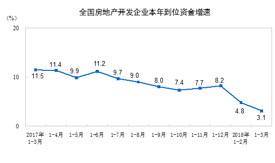 1-3月份,房地產(chǎn)開發(fā)企業(yè)到位資金36770億元,同比增長3.1%,增速比1-2月份回落1.7個百分點(diǎn)。其中,國內(nèi)貸款6957億元,增長0.9%;利用外資16億元,下降78.4%;自籌資金11449億元,增長5.1%;定金及預(yù)收款11130億元,增長11.2%;個人按揭貸款5160億元,下降6.8%。