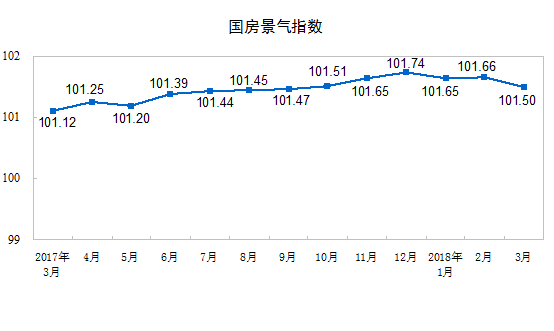 3月份,房地產(chǎn)開發(fā)景氣指數(shù)(簡稱“國房景氣指數(shù)”)為101.50,比2月份回落0.16點(diǎn)。
