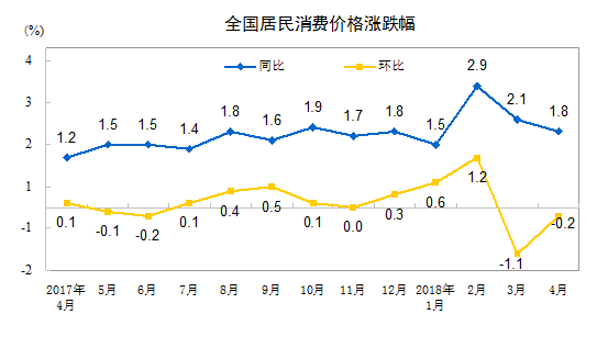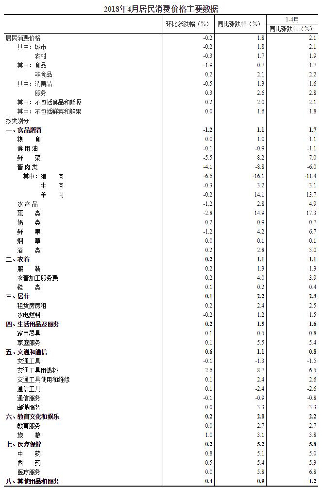 2018年4月份,全國居民消費價格同比上漲1.8%。其中,城市上漲1.8%,農村上漲1.7%;食品價格上漲0.7%,非食品價格上漲2.1%;消費品價格上漲1.3%,服務價格上漲2.6%。1-4月平均,全國居民消費價格總水平比去年同期上漲2.1%。