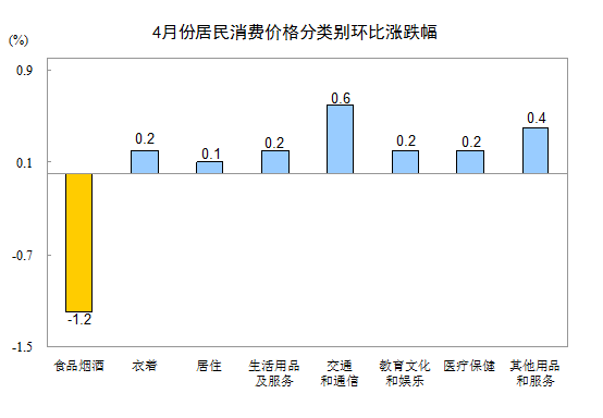 4月份,全國居民消費價格環比下降0.2%。其中,城市下降0.2%,農村下降0.3%;食品價格下降1.9%,非食品價格上漲0.2%;消費品價格下降0.5%,服務價格上漲0.3%。