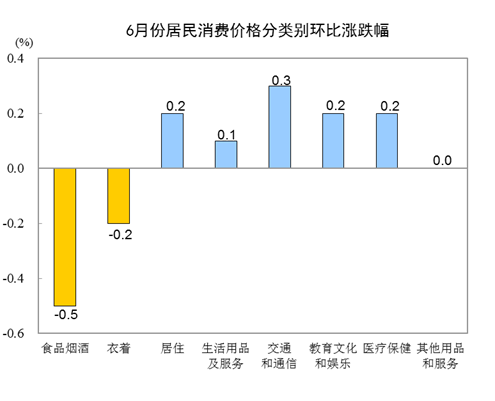 6月份,全國居民消費價格環(huán)比下降0.1%。其中,城市持平,農村下降0.1%;食品價格下降0.8%,非食品價格上漲0.1%;消費品價格下降0.2%,服務價格上漲0.2%。