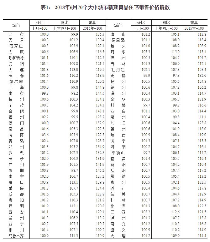 2018年6月份70個大中城市住宅銷售價格變動情況