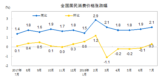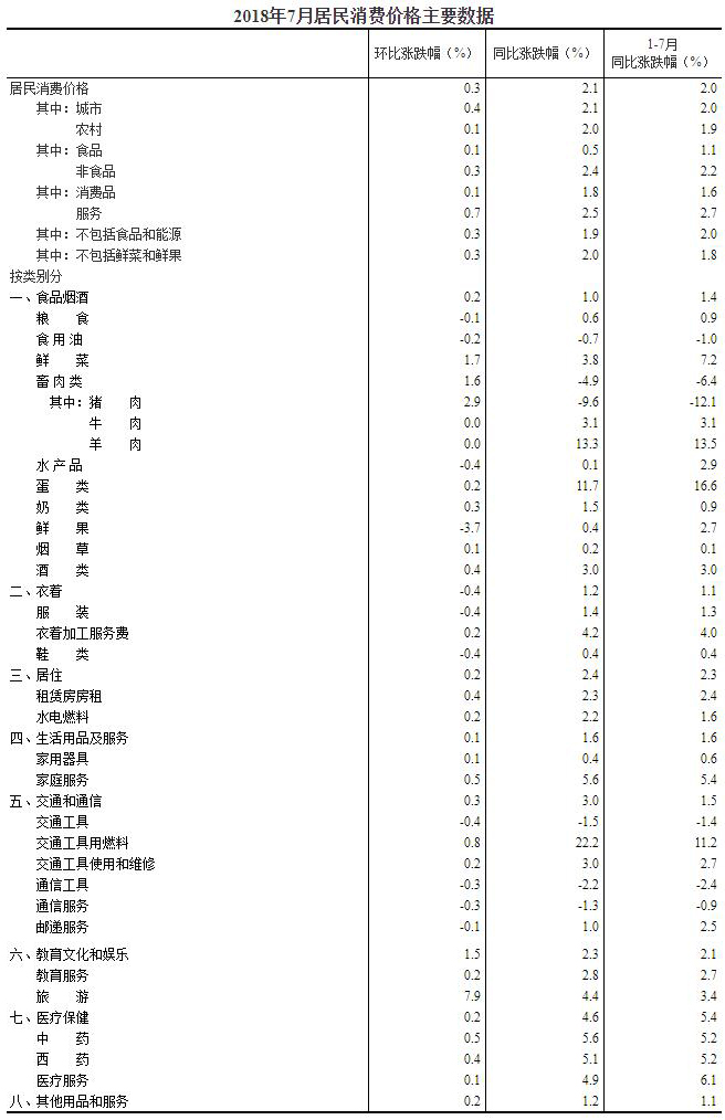 2018年7月份,全國居民消費價格同比上漲2.1%。其中,城市上漲2.1%,農村上漲2.0%;食品價格上漲0.5%,非食品價格上漲2.4%;消費品價格上漲1.8%,服務價格上漲2.5%。1-7月平均,全國居民消費價格比去年同期上漲2.0%。