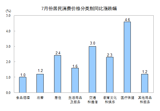 其他七大類價格同比均上漲。其中,醫療保健、交通和通信、居住價格分別上漲4.6%、3.0%和2.4%,教育文化和娛樂、生活用品及服務價格分別上漲2.3%和1.6%,衣著、其他用品和服務價格均上漲1.2%。