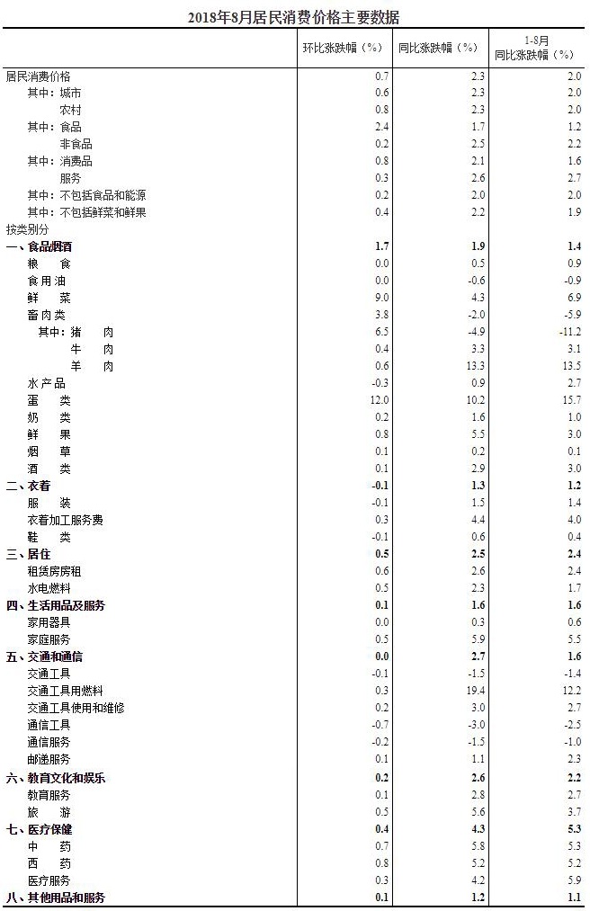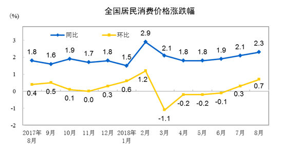 2018年8月份,全國居民消費價格同比上漲2.3%。其中,城市上漲2.3%,農村上漲2.3%;食品價格上漲1.7%,非食品價格上漲2.5%;消費品價格上漲2.1%,服務價格上漲2.6%。1-8月平均,全國居民消費價格比去年同期上漲2.0%。