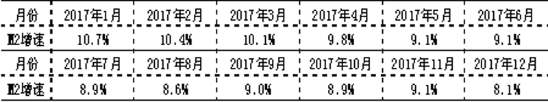 注2:2018年1月,人民銀行完善貨幣供應量中貨幣市場基金部分的統計方法,用非存款機構部門持有的貨幣市場基金取代貨幣市場基金存款(含存單)。完善后,2017年各月末M2增速如下: