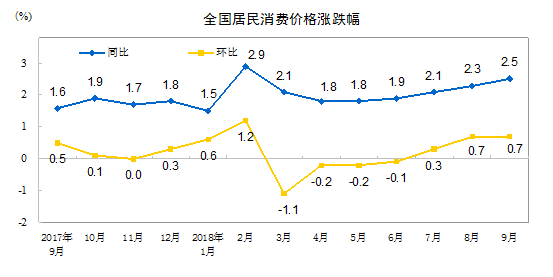 2018年9月份,全國居民消費價格同比上漲2.5%。其中,城市上漲2.4%,農村上漲2.5%;食品價格上漲3.6%,非食品價格上漲2.2%;消費品價格上漲2.7%,服務價格上漲2.1%。1-9月平均,全國居民消費價格比去年同期上漲2.1%。