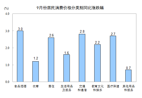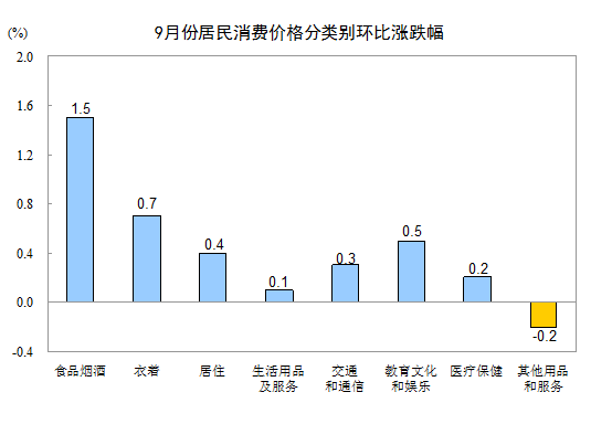 9月份,全國居民消費價格環比上漲0.7%。其中,城市上漲0.7%,農村上漲0.8%;食品價格上漲2.4%,非食品價格上漲0.3%;消費品價格上漲1.0%,服務價格上漲0.2%。