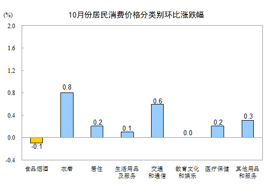10月份,全國居民消費(fèi)價(jià)格環(huán)比上漲0.2%。其中,城市上漲0.2%,農(nóng)村上漲0.2%;食品價(jià)格下降0.3%,非食品價(jià)格上漲0.3%;消費(fèi)品價(jià)格上漲0.3%,服務(wù)價(jià)格持平。