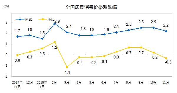 2018年11月份,全國居民消費價格同比上漲2.2%。其中,城市上漲2.2%,農村上漲2.2%;食品價格上漲2.5%,非食品價格上漲2.1%;消費品價格上漲2.2%,服務價格上漲2.1%。1-11月平均,全國居民消費價格比去年同期上漲2.1%。