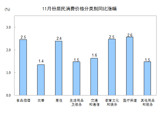 其他七大類價格同比均上漲。其中,醫療保健、教育文化和娛樂價格分別上漲2.6%和2.5%,居住、交通和通信價格分別上漲2.4%和1.6%,生活用品及服務、其他用品和服務、衣著價格分別上漲1.5%、1.5%和1.4%。