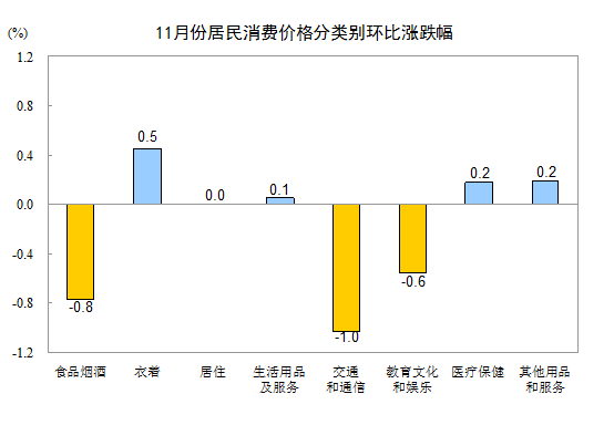 11月份,全國居民消費價格環比下降0.3%。其中,城市下降0.4%,農村下降0.3%;食品價格下降1.2%,非食品價格下降0.1%;消費品價格下降0.5%,服務價格下降0.2%。